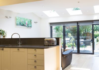 Zoe and Graham had a great home and after completing a attic conversion giving them plenty of bedroom space, they wanted a large ground floor living space for themselves and their two children to further enjoy. We built a ground floor rear extension, creating a kitchen/dinner and lounge area, which worked as a versatile space for their family. The builders installed a large set of bi-folding doors and Velux roof windows, filling the room with light and space. Zoe and Graham’s garden was south facing and in order to keep the back of the house cool in the summer, they opted for an electric remote controlled awning to use on sunny days. In addition to this, they chose electric exterior sun blinds fitted to the Velux, windows, for maximum flexibility. Three years on from the extension Zoe and Graham remain very happy with their build, as expressed in their testimonial.